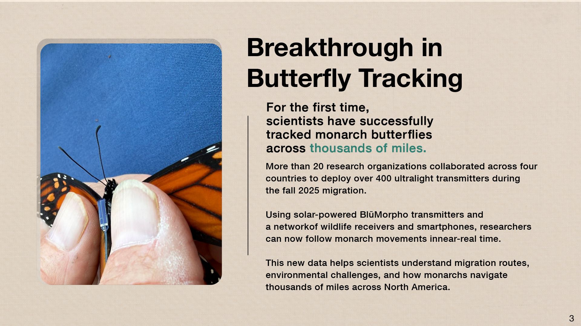 For this project, I explored how typography and layout can help communicate scientific research clearly. I started by finding research that interested me and used an article about monarch butterfly migration tracking as the source material.